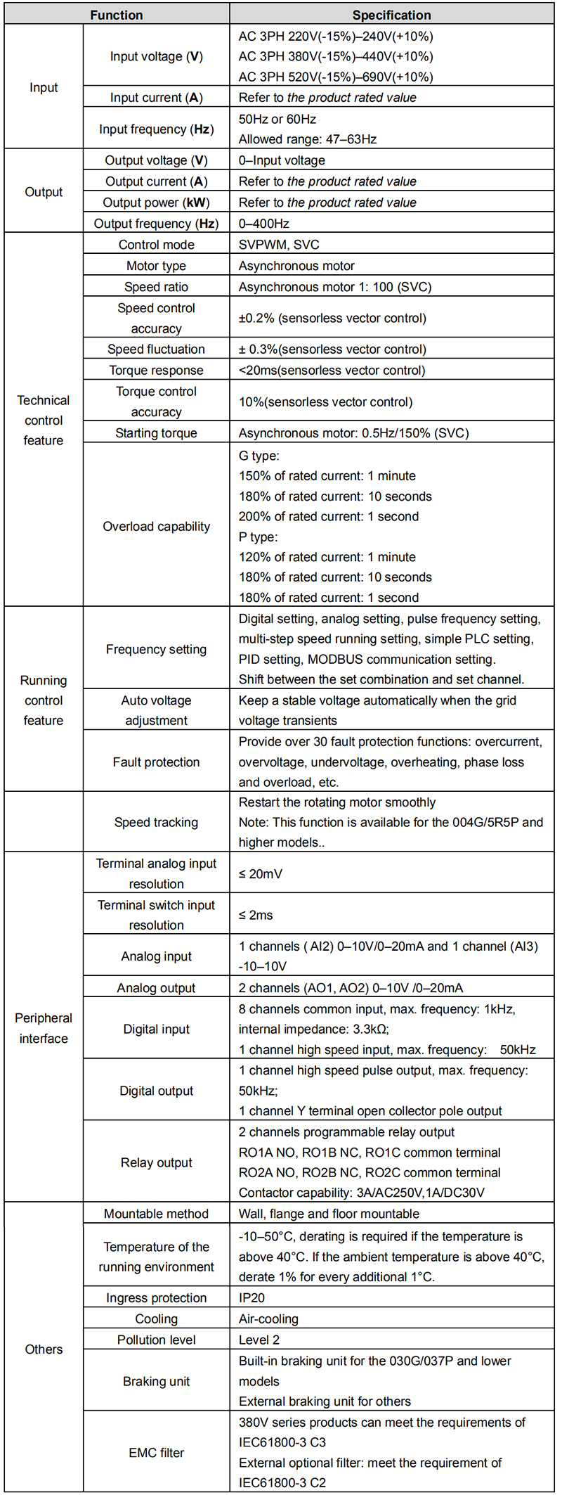 3.Built-in braking unit (≤30kW), Optional external braking unit (≥37kW)