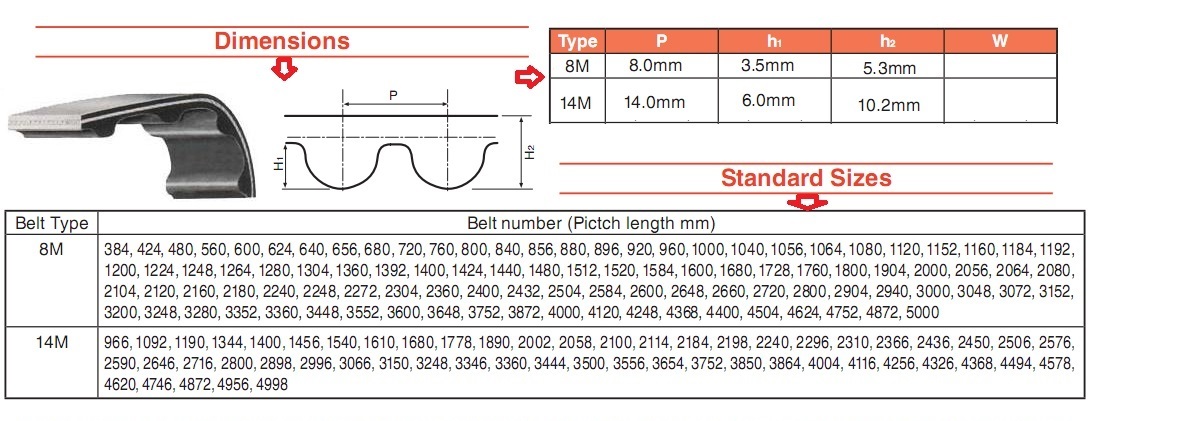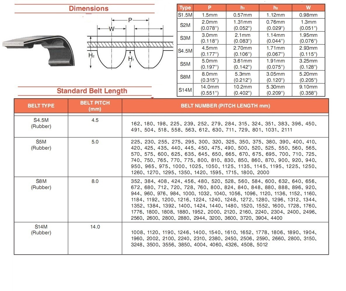 Dây Curoa răng (tròn & Vuông) loại S1.5M, S3M, S4.5M, S5M, S8M, S14M, 4.5M, 5M, 8M, 14M ( S -răng vuông, H: răng tròn)